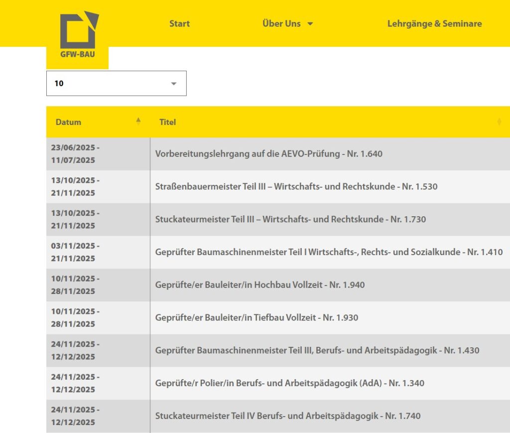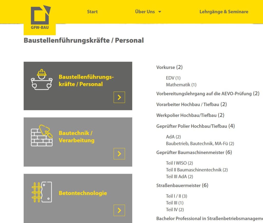 Challenge: GFW-BAU offers a wide range of modular training programs and qualifications. Presenting this complex information in a structured and comprehensible way for different user groups (e.g., trainees, companies, admins) was a significant challenge.